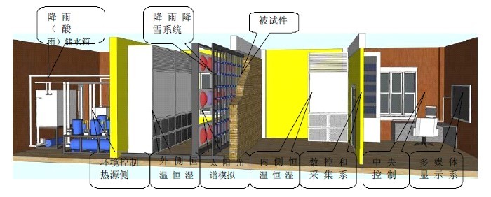 建筑動(dòng)態(tài)環(huán)境實(shí)驗(yàn)技術(shù)是國(guó)際建筑技術(shù)科學(xué)領(lǐng)域的前沿實(shí)驗(yàn)技術(shù),是研究建筑材料、構(gòu)件和系統(tǒng)性能退化及耐久性的關(guān)鍵實(shí)驗(yàn)方法,同時(shí)還可以開(kāi)展建筑節(jié)能、建筑人居環(huán)境等方向的實(shí)驗(yàn)研究。大型建筑全環(huán)境艙動(dòng)態(tài)實(shí)驗(yàn)平臺(tái)是開(kāi)展建筑動(dòng)態(tài)環(huán)境實(shí)驗(yàn)的大型實(shí)驗(yàn)系統(tǒng),代表了該領(lǐng)域先進(jìn)的實(shí)驗(yàn)技術(shù)。本實(shí)驗(yàn)系統(tǒng)核心技術(shù)為多環(huán)境參數(shù)同步耦合的動(dòng)態(tài)模擬,不同于傳統(tǒng)的單一環(huán)境參數(shù)穩(wěn)態(tài)環(huán)境模擬。本系統(tǒng)可模擬動(dòng)態(tài)的溫濕度變化、紅外太陽(yáng)輻照、紫外太陽(yáng)輻射、降雨(酸雨)、降雪、陣風(fēng)等自然環(huán)境條件。