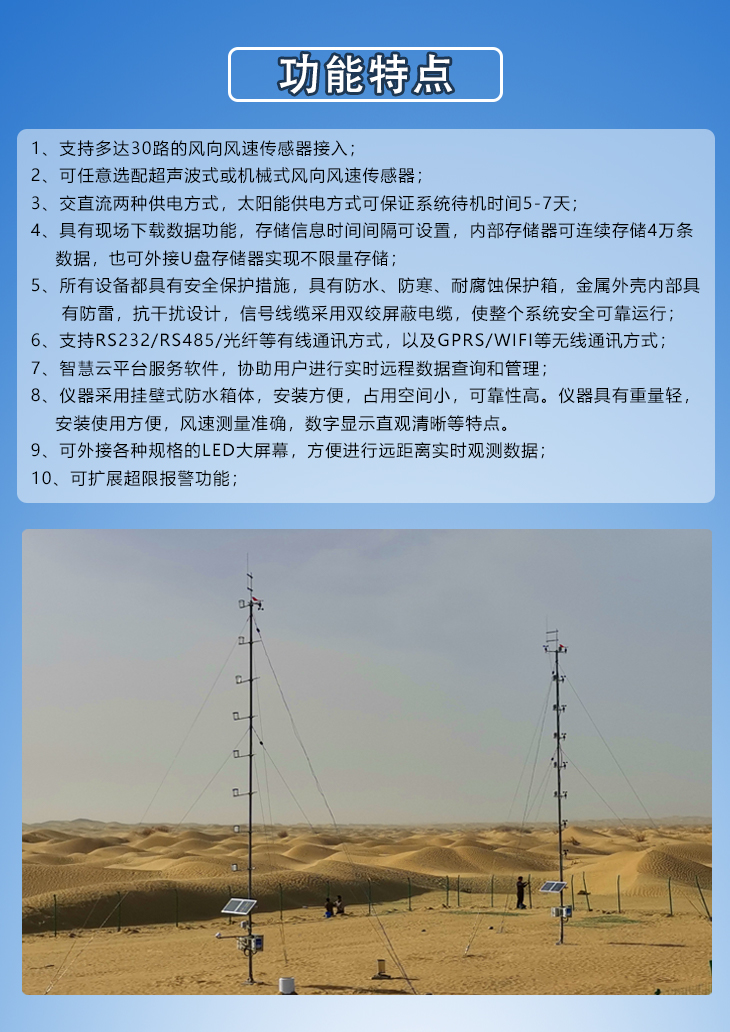 由于受到地表摩擦的作用,接近地表的風(fēng)速隨著離地面距離的減小而降低,造成同一位置不同高度的風(fēng)速風(fēng)向存在差異,這樣就會(huì)對(duì)一些行業(yè)運(yùn)行產(chǎn)生影響。我公司生產(chǎn)的PC-2F型多通道風(fēng)向風(fēng)速監(jiān)測(cè)站是由新一代的多通道風(fēng)速風(fēng)向監(jiān)測(cè)記錄儀與風(fēng)向風(fēng)速傳感器組成的,用于觀(guān)測(cè)記錄同一位置不同高度的風(fēng)向風(fēng)速瞬時(shí)值及平均值的專(zhuān)業(yè)設(shè)備,具有測(cè)量精度高、人機(jī)界面友好、人工干預(yù)少、交直流供電等特點(diǎn)。