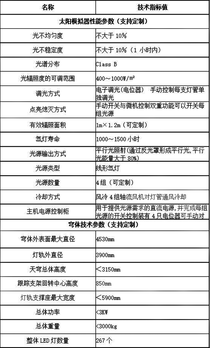 4、模擬陰天各向異性散射輻射,被輻照面輻照均勻度≥90%,光源穩(wěn)定性≥90%,被輻照面輻照值12~200 W/m²;