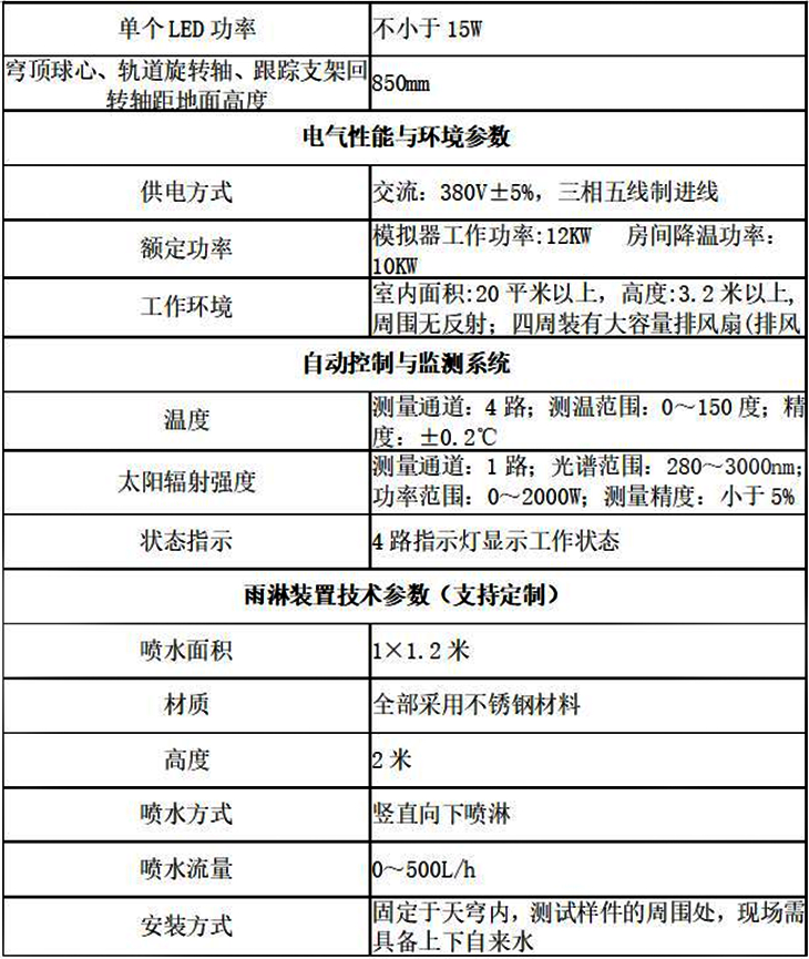 該系統(tǒng)主要包括四大部分:發(fā)光體、均光及調(diào)光系統(tǒng)、主體框架結(jié)構(gòu)、擴(kuò)散光源、電源控制柜、太陽(yáng)模擬系統(tǒng)智能控制柜、雨淋裝置、控制計(jì)算軟件。