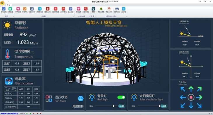 系統(tǒng)配置電腦端的控制軟件,軟件界面美觀,功能強(qiáng)大,可實(shí)現(xiàn)背景燈、模擬燈的明暗控制;模擬燈可以導(dǎo)入時(shí)間及功率比例進(jìn)行自動(dòng)控制;設(shè)定高度角 、方位角,自動(dòng)運(yùn)行到指定位置、設(shè)置好經(jīng)緯度,根據(jù)本機(jī)時(shí)間模擬太陽(yáng)自動(dòng)運(yùn)行到指定位置;東西上下手動(dòng)控制等功能。