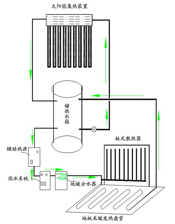太陽(yáng)能集熱器采集太陽(yáng)的能量,把冷水逐漸加熱,儲(chǔ)存在保溫水箱內(nèi),待需要取暖時(shí)開啟加以利用,把水箱內(nèi)儲(chǔ)存的熱能通過(guò)地暖管路內(nèi)熱水的循環(huán)對(duì)室內(nèi)空間進(jìn)行釋放熱能,將室內(nèi)的冷空氣加熱,來(lái)提高室內(nèi)空間的環(huán)境溫度。滿足需要。太陽(yáng)能采暖系統(tǒng)由太陽(yáng)能集熱器(平板太陽(yáng)能集熱器、真空管太陽(yáng)能集熱器、U型管太陽(yáng)能集熱器、熱管太陽(yáng)能集熱器)、水箱、連接管道、控制系統(tǒng)等輔材構(gòu)成。將分散的太陽(yáng)能通過(guò)集熱器,把太陽(yáng)能轉(zhuǎn)換成熱水,將熱水儲(chǔ)存在水箱內(nèi),然后通過(guò)熱水輸送到地暖管路,提供建筑供熱的需求。