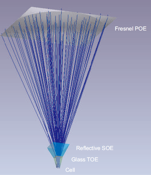 聚光光路設(shè)計(jì)中,入射光通過(guò)三級(jí)聚光部件進(jìn)行聚光。其中初級(jí)光學(xué)器件(菲涅爾非成像玻璃透鏡)裝配到組件框架結(jié)構(gòu)上,二三級(jí)光學(xué)器件裝配到聚光接收器模塊上。這種設(shè)計(jì)將入射接收角提高至±0.86°,同時(shí)提高光線均勻度。有效的提高了功率和效率。該光學(xué)器件及光路解決方案由德國(guó)知名光學(xué)設(shè)計(jì)公司提供。