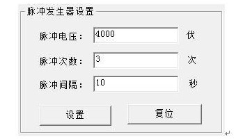 復(fù)位:點(diǎn)擊復(fù)位按鈕,系統(tǒng)將自動(dòng)設(shè)置為默認(rèn)參數(shù),脈沖電壓4000V,脈沖次數(shù):3次,脈沖間隔 10S
