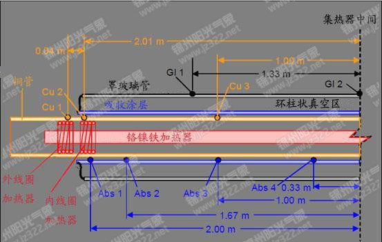 罩玻璃管(Gl)銅管(Cu)和內(nèi)管(Abs)熱偶計(jì)在高溫管的位置(另一半沒(méi)有標(biāo)出)銅管和罩玻璃管表面的熱電偶固定方法:用金屬絲把熱偶計(jì)纏繞在表面。