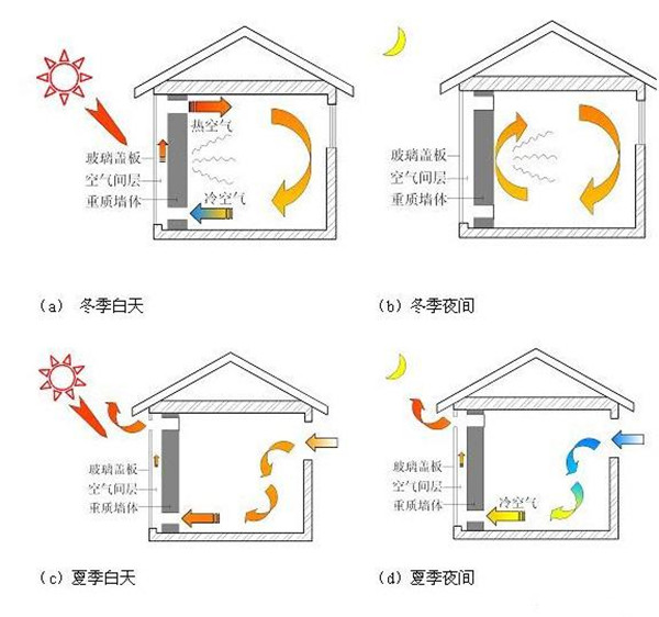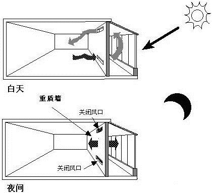 特朗伯集熱墻是一種依靠墻體獨(dú)特的構(gòu)造設(shè)計(jì),無(wú)機(jī)械動(dòng)力、無(wú)傳統(tǒng)能源消耗、僅僅依靠被動(dòng)式收集太陽(yáng)能為建筑供暖的集熱墻體。它由法國(guó)太陽(yáng)能實(shí)驗(yàn)室主任FelixTrombe教授及其合作者首先提出并實(shí)驗(yàn)成功的,故通稱為Trombewall(特朗伯墻)。特朗伯墻在冬、夏兩季以及白天、夜晚的工作運(yùn)行原理及要求均有所差別。