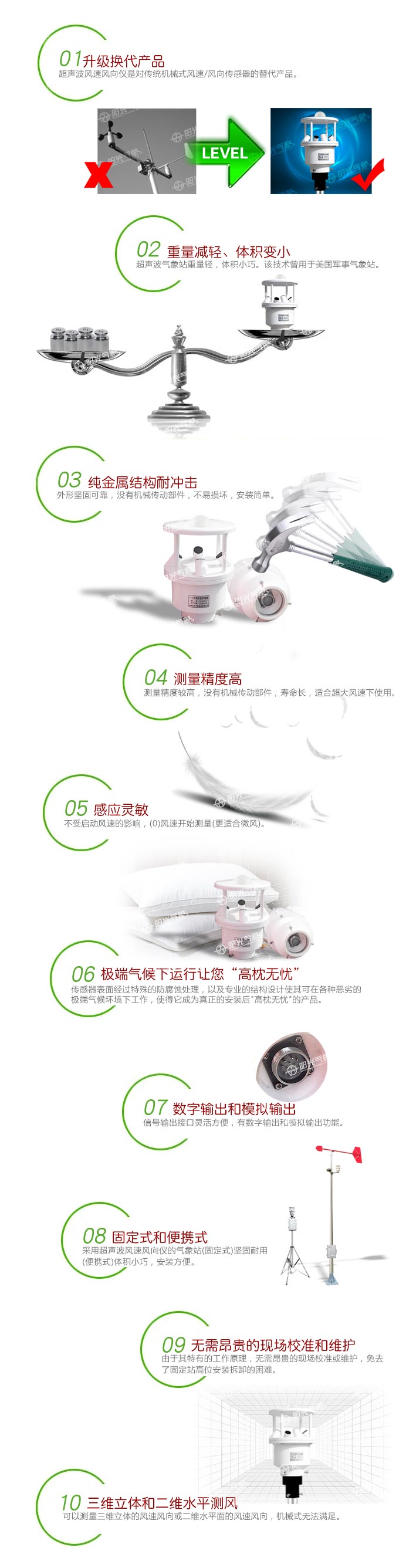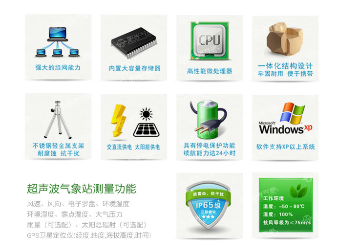 氣象站采用超聲波探頭來測量風(fēng)速和風(fēng)向,沒有任何移動部件,儀器結(jié)構(gòu)緊湊,更加耐用,數(shù)據(jù)更加可靠。也可用內(nèi)置的溫度、濕度和氣壓傳感器等傳感器探頭監(jiān)測相關(guān)氣候指標(biāo)。精確的測量數(shù)據(jù)可以幫助氣象、水利、交通及科研等組織提供精確的數(shù)據(jù)依據(jù)及判斷條件。
