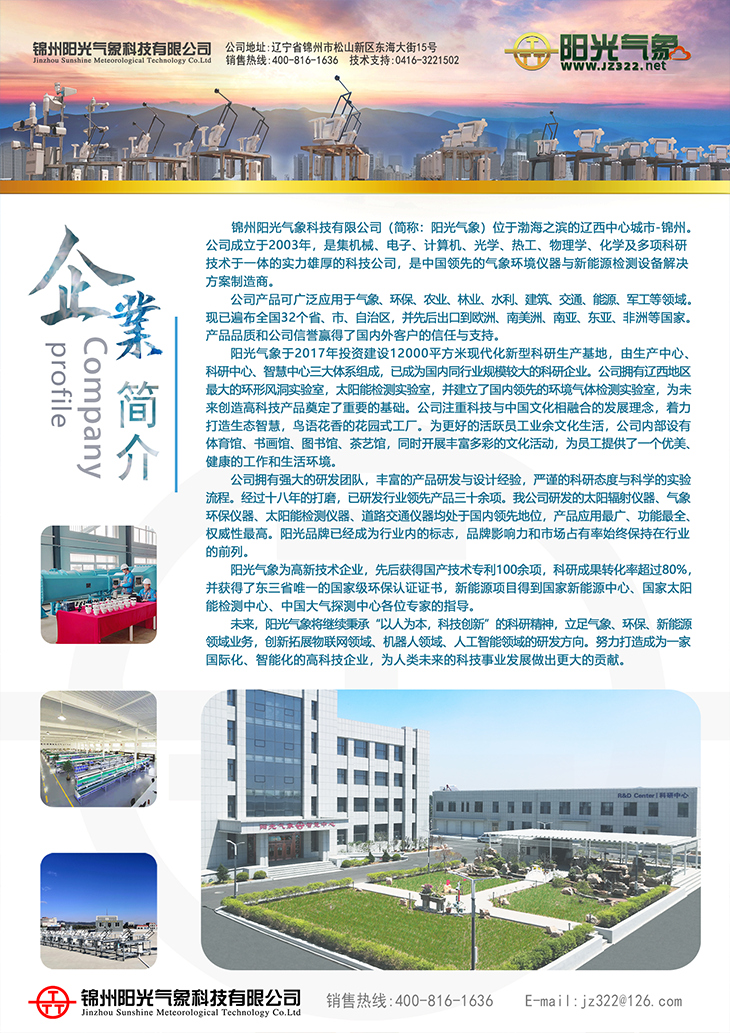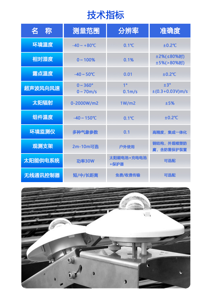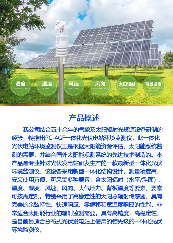 本產(chǎn)品是針對(duì)光伏發(fā)電站研發(fā)生產(chǎn)的一款最新型一體化光伏環(huán)境監(jiān)測儀,該設(shè)備采用新型一體化結(jié)構(gòu)設(shè)計(jì),測量精度高,安裝使用方便,可采集多種要素:含太陽輻射(水平/斜面)、溫度、濕度、風(fēng)速、風(fēng)向、大氣壓力、背板溫度等要素,要素可按需定制。