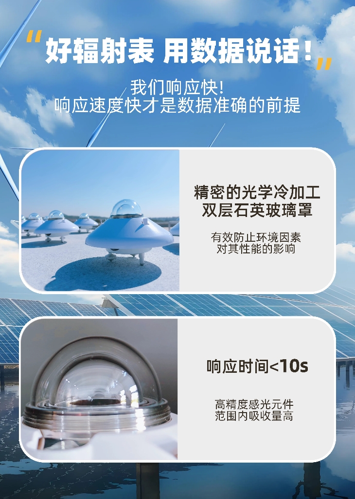 2、響應(yīng)快:響應(yīng)時(shí)間≤10S,對太陽輻射的微小變化都能迅速響應(yīng),確保數(shù)據(jù)的實(shí)時(shí)性和準(zhǔn)確性。