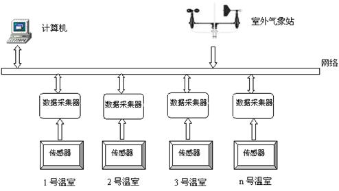日光溫室集群監(jiān)控系統(tǒng)包括:計(jì)算機(jī)、打印機(jī)、數(shù)據(jù)采集器、溫室用傳感器(溫度、濕度、光照等)、監(jiān)控軟件。