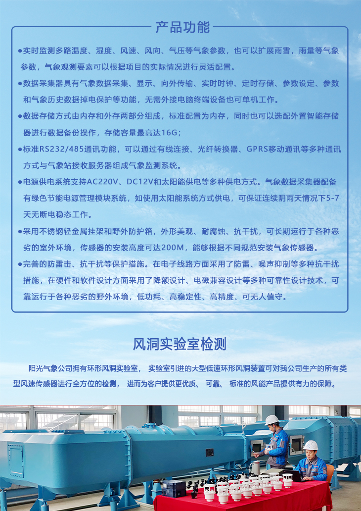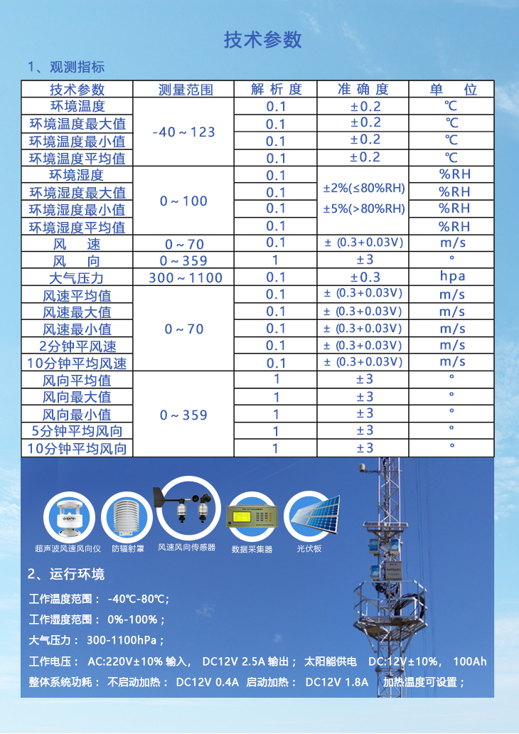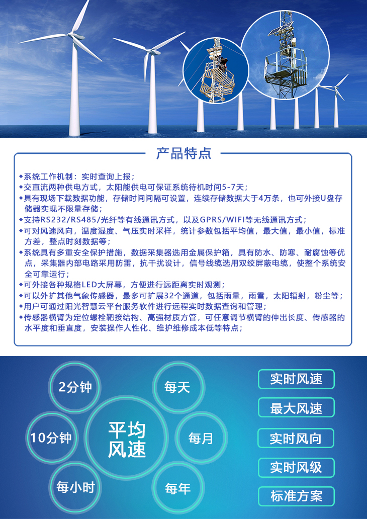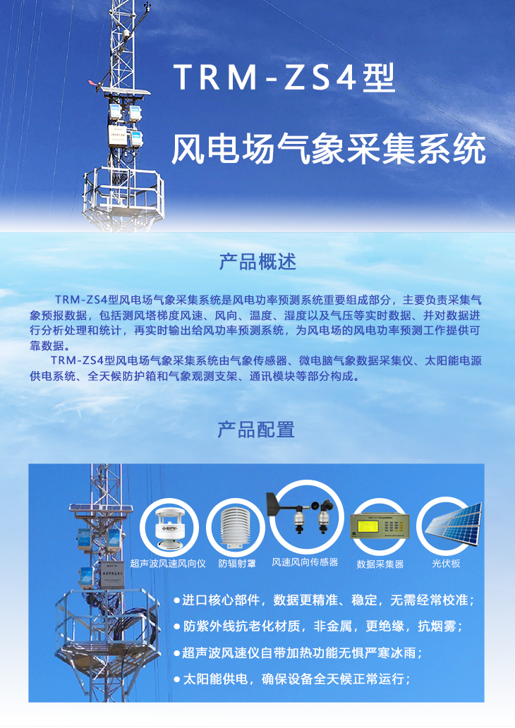 TRM-ZS4型風(fēng)電場氣象采集系統(tǒng)是風(fēng)電功率預(yù)測系統(tǒng)重要組成部分,主要負責(zé)采集氣象預(yù)報數(shù)據(jù),包括測風(fēng)塔梯度風(fēng)速、風(fēng)向、溫度、濕度以及氣壓等實時數(shù)據(jù)、并對數(shù)據(jù)進行分析處理和統(tǒng)計,再實時輸出給風(fēng)功率預(yù)測系統(tǒng),為風(fēng)電場的風(fēng)電功率預(yù)測工作提供可靠數(shù)據(jù)。TRM-ZS4型風(fēng)電場氣象采集系統(tǒng)由氣象傳感器、微電腦氣象數(shù)據(jù)采集儀、太陽能電源供電系統(tǒng)、全天候防護箱和氣象觀測支架、通訊模塊等部分構(gòu)成。