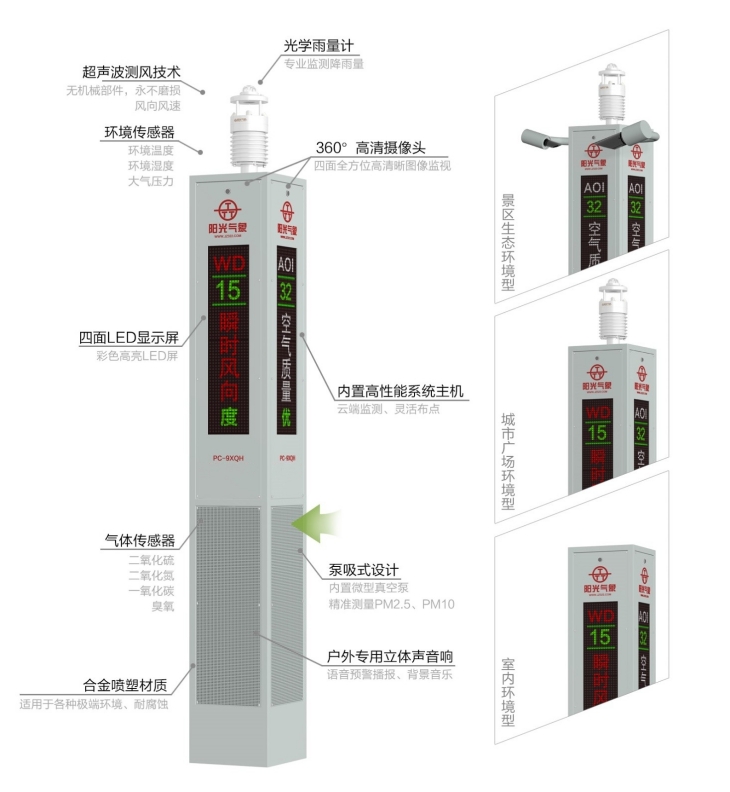 PC-9XQH 景區(qū)氣象站是錦州陽光氣象旗下的一款集氣象環(huán)境監(jiān)測、語音播報、LED彩屏顯示、智能安防、美化園林等功能于一體的智能平臺型氣象環(huán)境監(jiān)測產(chǎn)品。實現(xiàn)了物聯(lián)網(wǎng)云端監(jiān)測,是基于大數(shù)據(jù)軟件技術和智能傳感器硬件技術研發(fā)出的新一代高科技產(chǎn)品。