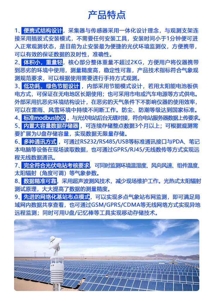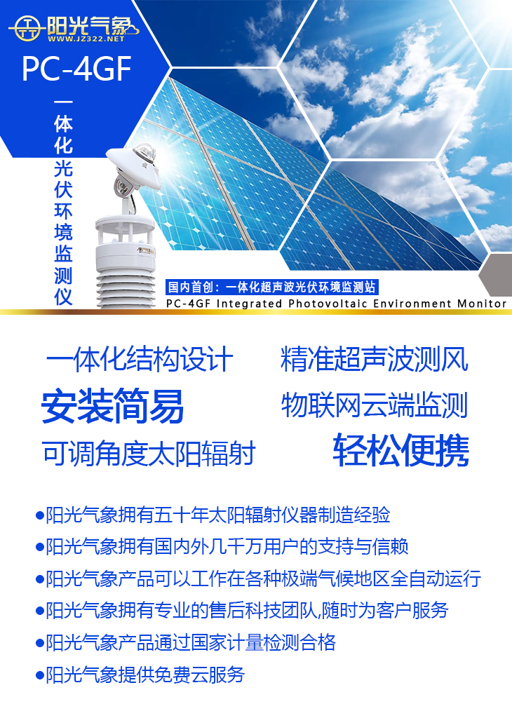 本產(chǎn)品是專業(yè)針對光伏發(fā)電站研發(fā)生產(chǎn)的一體化光伏環(huán)境監(jiān)測儀,該設(shè)備采用新型一體化結(jié)構(gòu)設(shè)計,測量精度高,安裝使用方便,采用獨特的一體化超聲波微氣象儀,集溫濕度、風速、風向、壓力、背板溫度集成于一體。具有高精度,高穩(wěn)定性,是目前非常適合光伏發(fā)電站上使用的一體化光伏環(huán)境監(jiān)測儀。