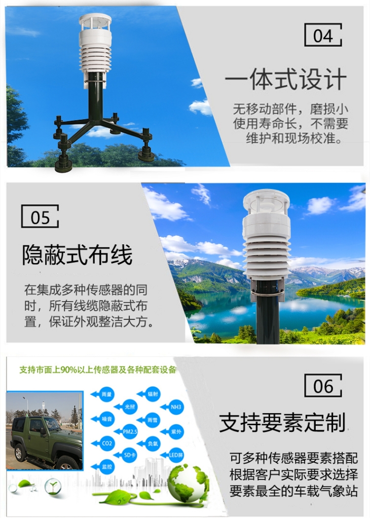PC-4A車(chē)載氣象站是在結(jié)構(gòu)設(shè)計(jì)和觀測(cè)要素方面專(zhuān)門(mén)為移動(dòng)應(yīng)急環(huán)境而設(shè)計(jì)的一款綜合觀測(cè)自動(dòng)氣象站。它可以監(jiān)測(cè)風(fēng)向風(fēng)速、空氣溫濕度、降雨、氣壓、噪聲、太陽(yáng)輻射等氣象要素,也可以測(cè)量PM2.5、PM10、CO、NO2、SO2、O3等氣體和顆粒物指標(biāo)。