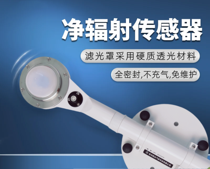 凈輻射表用來測量太陽輻射及地面輻射的凈差值。測量范圍為0.28~3μm的短波輻射和3~50μm的地球輻射。該傳感器的工作原理為熱電效應原理,感應部分是由康銅絲鍍銅組成的熱電堆,熱電堆的上下兩個面緊貼著涂有無光黑漆的感應面,兩個熱電堆分別接收太陽輻射和大地輻射。由于上下感應面吸收輻照度不同,使得熱電堆兩端產(chǎn)生溫度差異,其輸出電動勢與感應面接收的輻照度差值成正比。凈輻射為正值表示地表增熱,凈輻射為負值表示地表損失熱量。廣泛應用于農(nóng)業(yè)氣象、土壤水分蒸發(fā)蒸騰損失總量計算、農(nóng)作物災害預防及熱平衡相關的建筑機理研究。