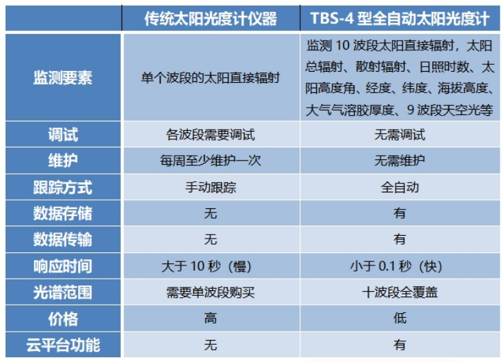 1、采用了同步測量技術,除了可以同時監(jiān)測10個波段的直接輻射外,還可以監(jiān)測同一時刻太陽的總輻射、散射輻射、日照時數、太陽高度角、9個波段天空光等要素。它解決了國外同類儀器分時測量存在時間誤差的問題,這種測量模式會大大提高太陽的光譜分析精度;