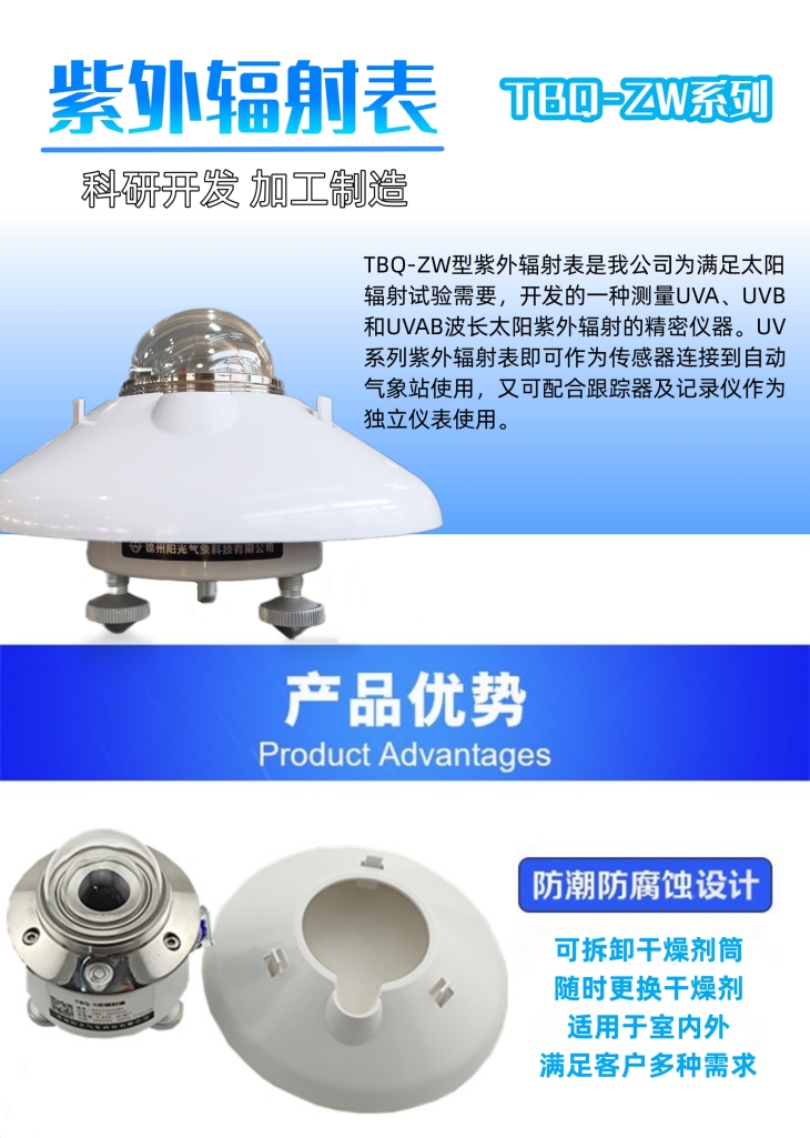 TBQ-ZW型紫外輻射表是我公司為滿足太陽(yáng)輻射試驗(yàn)的需要,開(kāi)發(fā)的一種測(cè)量UVA、UVB和UVAB波長(zhǎng)太陽(yáng)紫外輻射的精密儀器。UV系列紫外輻射表即可作為傳感器連接到自動(dòng)氣象站使用,又可配合跟蹤器及記錄儀作為獨(dú)立儀表使用。