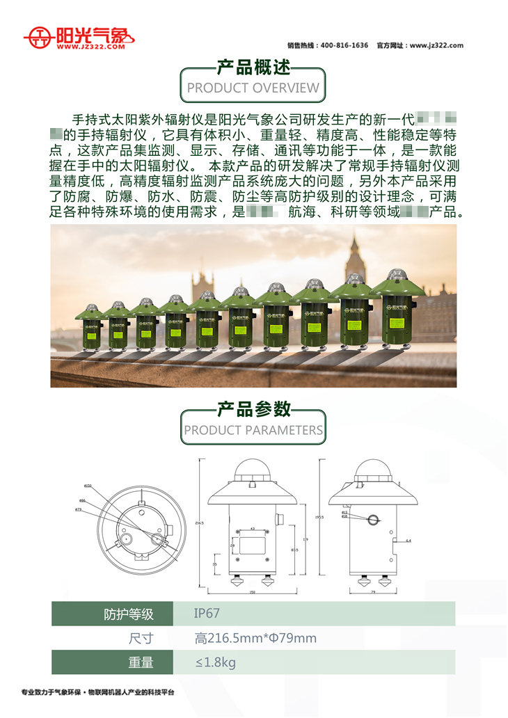 TBQ-ZW-SC手持式紫外輻射儀是陽光氣象開發(fā)生產(chǎn)的新一代手持輻射儀。它具有體積小、重量輕、精度高、穩(wěn)定性強(qiáng)等特點(diǎn)。這款產(chǎn)品集監(jiān)測(cè)、顯示、存儲(chǔ)、通訊等功能于一體,解決了常規(guī)手持輻射儀精度低,高精度輻射監(jiān)測(cè)產(chǎn)品系統(tǒng)龐大的問題。