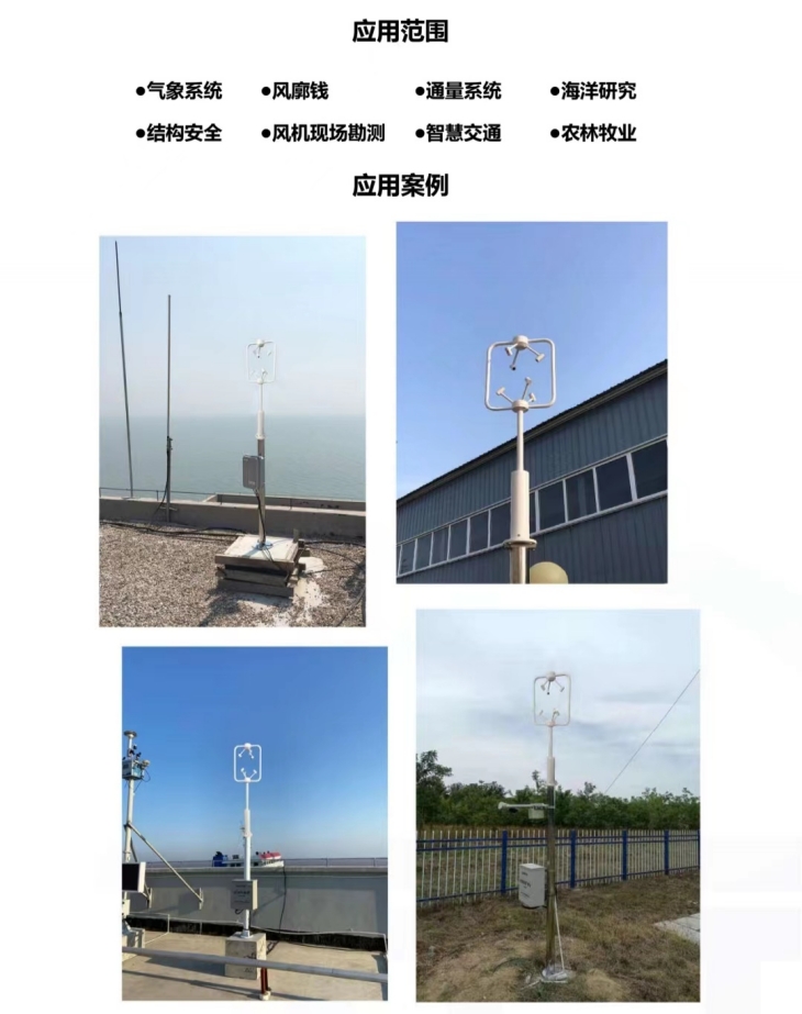 三維超聲波風(fēng)速風(fēng)向傳感器具有結(jié)構(gòu)緊湊,沒有任何移動部件,堅(jiān)固 耐用的特點(diǎn)。能夠測量水平和垂直方向的風(fēng)向, X/Y/Z軸風(fēng)速(即U、V、 W矢量輸出)。可以適應(yīng)在各種環(huán)境下,全天候、長久的正常工作,為各 領(lǐng)域的氣象監(jiān)測提供可靠數(shù)據(jù)。三維超聲波風(fēng)向風(fēng)速傳感器用來測量近 地風(fēng)向、風(fēng)速。廣泛應(yīng)用于城市環(huán)境監(jiān)測、風(fēng)力發(fā)電、氣象監(jiān)測、橋梁 隧道、航海船舶、航空機(jī)場等領(lǐng)域。