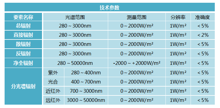 太陽輻射是氣象觀測指標(biāo)中重要內(nèi)容,根據(jù)國際氣象組織WMO標(biāo)準(zhǔn)要求,太陽輻射標(biāo)準(zhǔn)觀測分為:總輻射、散射輻射、直接輻射、反射輻射、凈全輻射,太陽光譜輻射(紫外光、可見光,近紅外光,遠(yuǎn)紅外光)