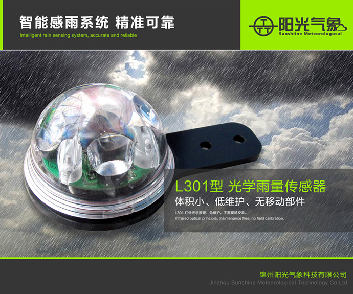 L301型光學雨量傳感器是錦州陽光研發(fā)的新型光學雨量傳感器,使用光束的紅外光檢測觸及外表面的雨滴,它比一個典型的翻斗式雨量計要靈敏100倍,并單個計數(shù)雨滴,發(fā)送脈沖信號。
